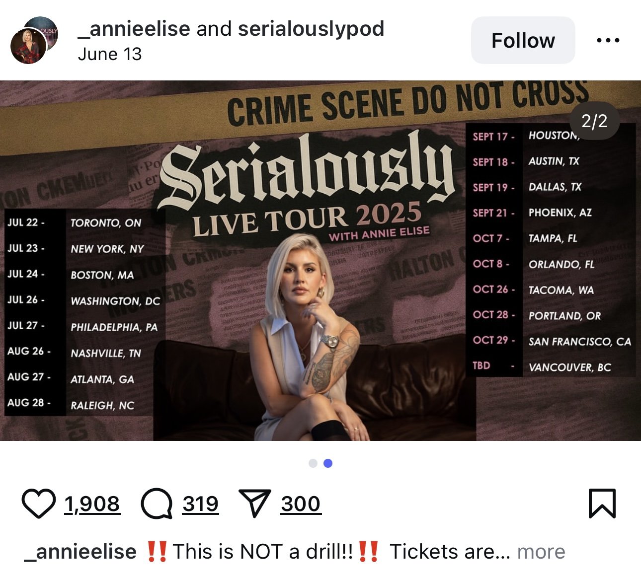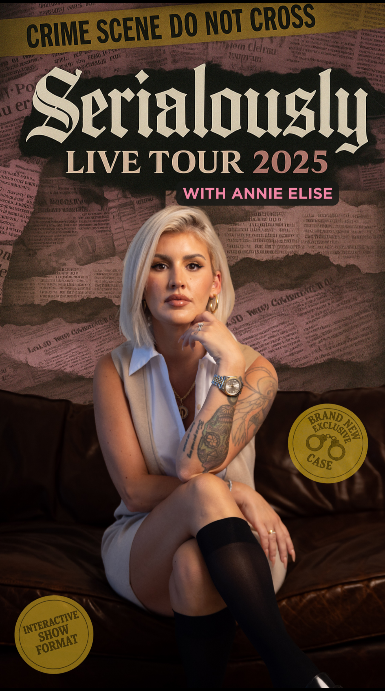 The Dharma Digital partnered with true crime podcaster and internet personality Annie Elise to develop visual assets for the Serialously 2025 live podcast tour.